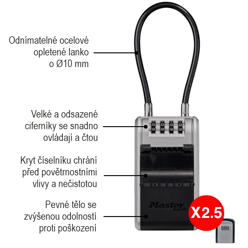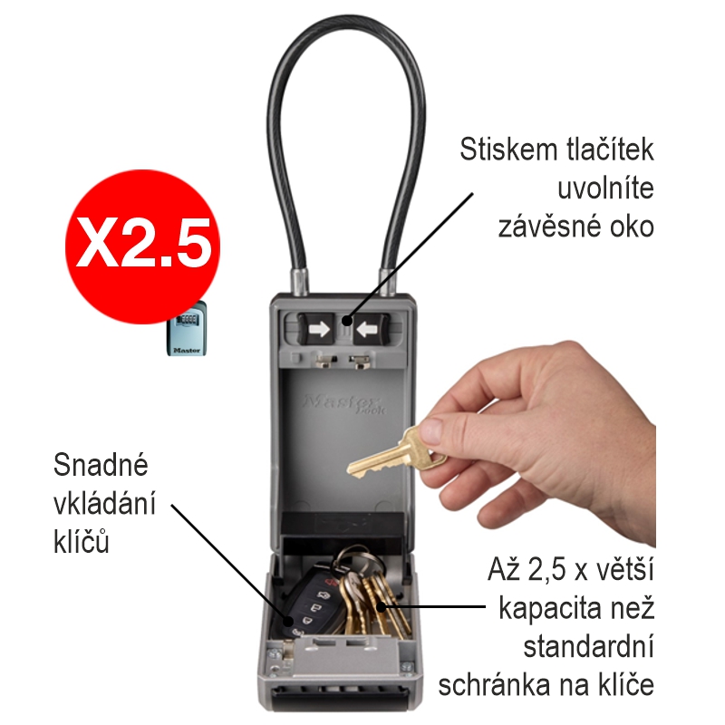 – Zvýšená kapacita úložiště – až 2,5x větší kapacita. Kapacita schránky je přibližně 2,5násobkem kapacity standardní schránky na klíče. Umožňuje bezpečné uložení až 10 klíčů (klíčenky, karty a velké klíče).