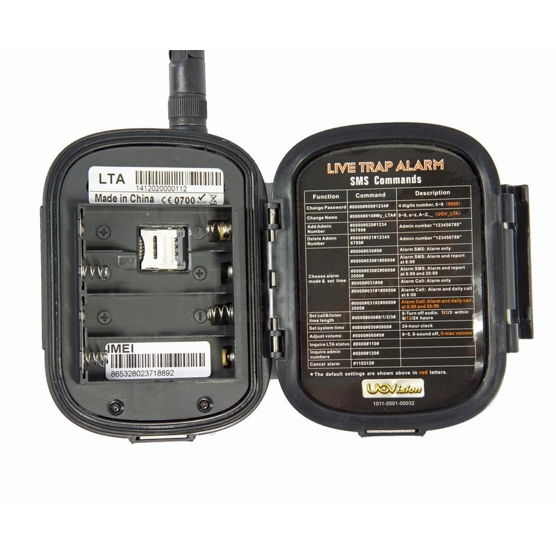 GSM alarm na pasti UOVision Live Trap Alarm (LTA) určený především ke střežení fotopastí, odchytových a krmných zařízení, ale použitelný také jako jednoduchý prostředek detekující narušení střeženého prostoru. Jakmile je přerušen kontakt mezi alarmem a magnetem, který je opatřen lankem, dojde k aktivaci alarmu a odeslání SMS až na 5 přednastavených telefonních čísel.
