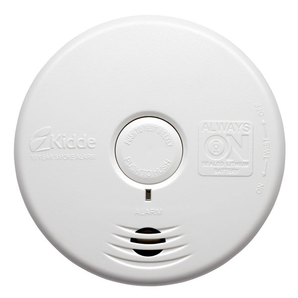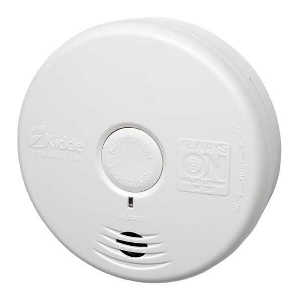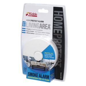 Hlásič požáru série Kidde HOME PROTECT pro OBÝVACÍ MÍSTNOSTI s optickým (fotoelektrickým) senzorem, napájený lithiovou baterií (zabudovanou, neměnitelnou) garantující napájení zařízení po dobu 10 let a 10letou záruku.