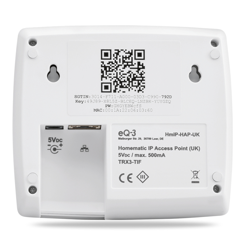 Centrální jednotka (HmIP-HAP) je připojena ke standardnímu routeru ethernetovým kabelem (RJ-45) a slouží jako rozhraní mezi cloudem Homematic IP umístěným výhradně na serverech v Německu a zařízeními Homematic IP ve vaší domácnosti.