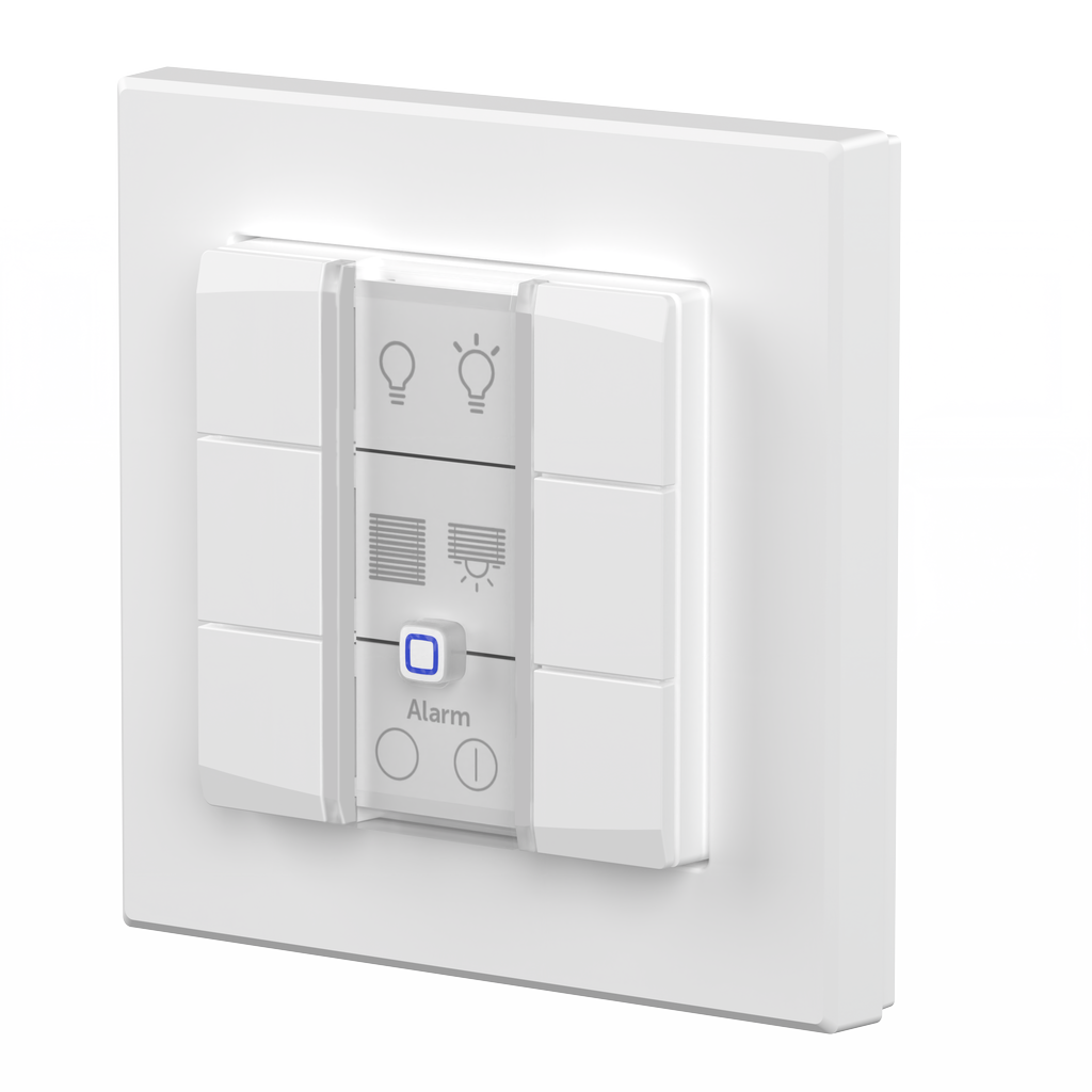 Šest individuálně programovatelných tlačítek umožňuje ovládat světla, rolety, topení, zabezpečení i celé scény – vše najednou, rychle a spolehlivě, přímo ze zdi bez nutnosti sahat po telefonu. Každé tlačítko lze libovolně přiřadit k jakékoli funkci nebo skupině zařízení v systému Homematic IP. Jediným stiskem lze spustit například scénu „Odchod z domu“, která zhasne světla, stáhne rolety a aktivuje alarm – vše současně.