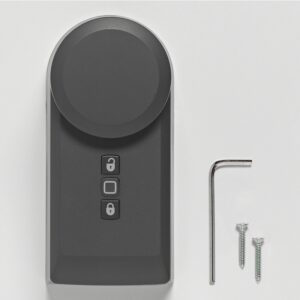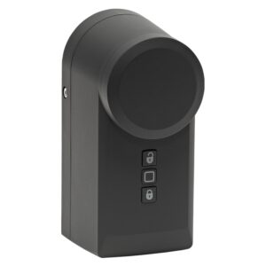 Bezdrátový inteligentní Pohon dveřního zámku v antracitové barvě (HmIP-DLD-A) určený k pohodlnému, motoricky poháněnému odemykání, zamykání a otevírání dveří je součástí systému chytré domácnosti Homematic IP.
