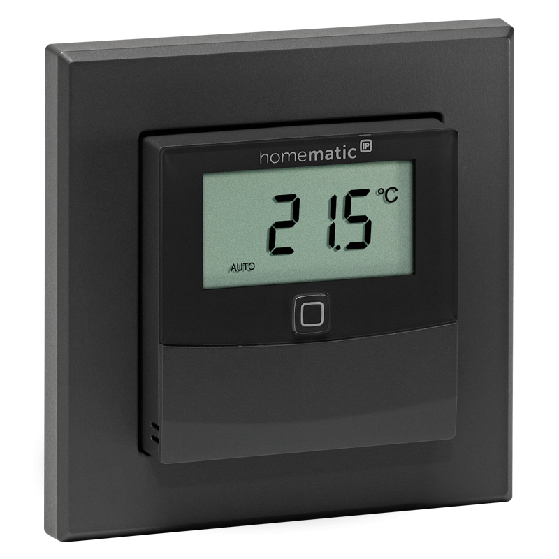 Bezdrátový nástěnný Senzor teploty a vlhkosti v antracitové barvě (HmIP-STHD-A) s LED displejem o velikosti 1,74″ (4,4 cm) pro zobrazení aktuálních informací představuje inteligentní způsob pro regulaci vytápění a úsporu energií.