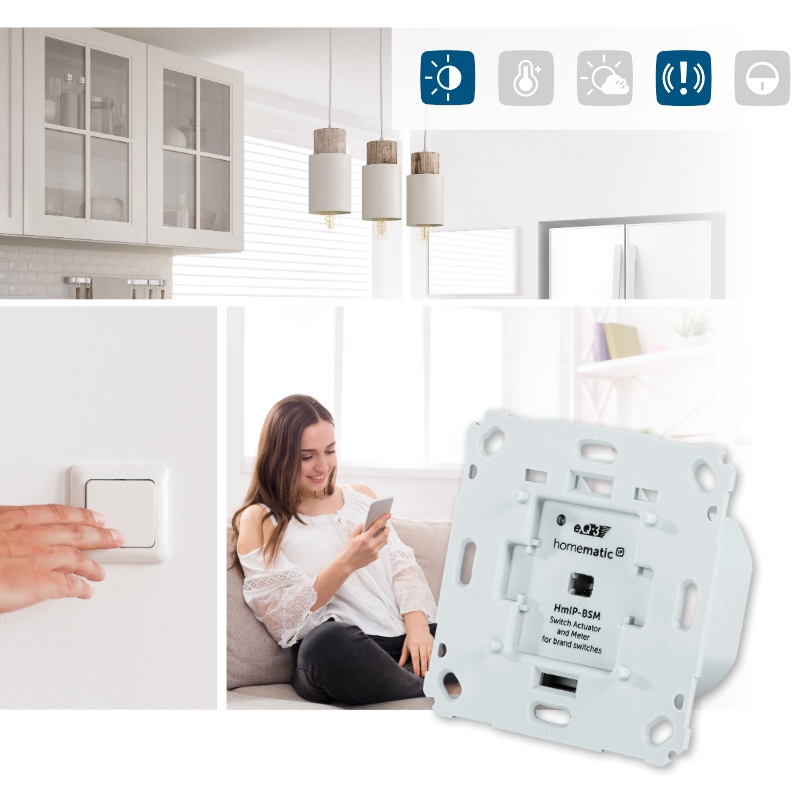 Spínací akční člen (HmIP-BSM) se montuje do standardní zápustné krabice pod omítku s připojením do sítě 230 V. Bezdrátová komunikace nabízí možnost instalace bez potřeby druhotné kabeláže. To znamená, že akční člen lze umístit v místě připraveného nebo stávajícího elektrického rozvodu sítě 230 V.