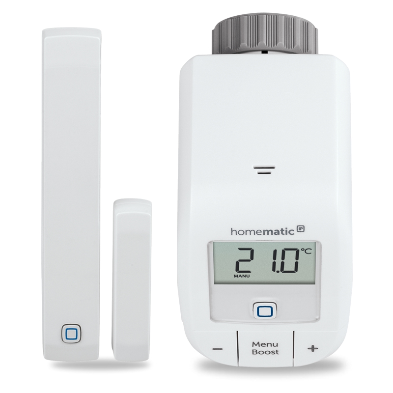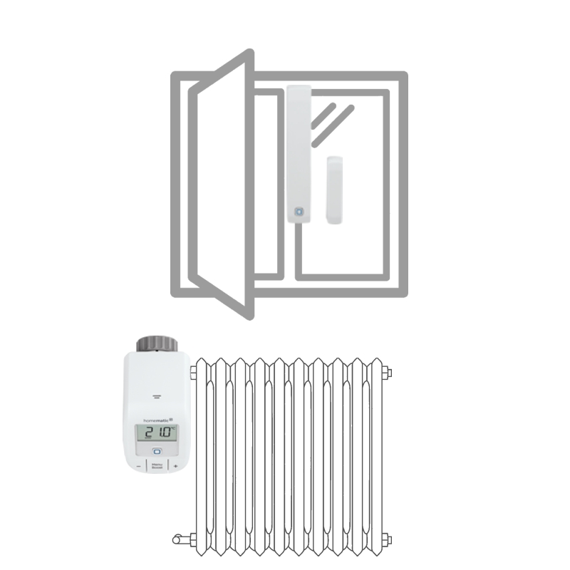 V autonomní sadě pro regulaci vytápění (HmIP-SK9) plní okenní a dveřní senzor HmIP-SWDM v kombinaci s bezdrátovou Termostatickou hlavicí Basic HmIP-eTRV-B), funkci magnetického kontaktu, který v případě detekce otevření okna předá informaci a termostatická hlavice automaticky sníží přísun horké vody do radiátorového tělesa. Jakmile se okno zavře, radiátor začne znovu zvyšovat teplotu v místnosti.