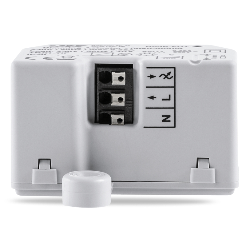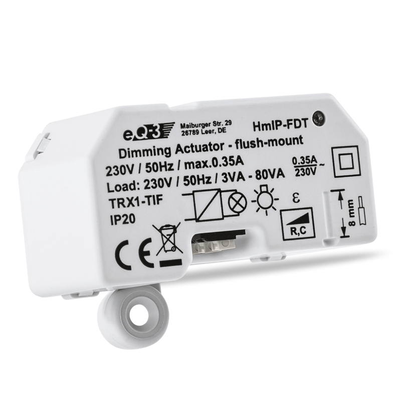 Stmívací akční člen (HmIP-FDT) se montuje do standardní zápustné krabice pod omítku nebo do krabice pro povrchovou montáž s připojením do sítě 230 V. Bezdrátová komunikace nabízí možnost instalace bez potřeby druhotné kabeláže. To znamená, že akční člen lze umístit v místě připraveného nebo stávajícího elektrického rozvodu sítě 230 V.