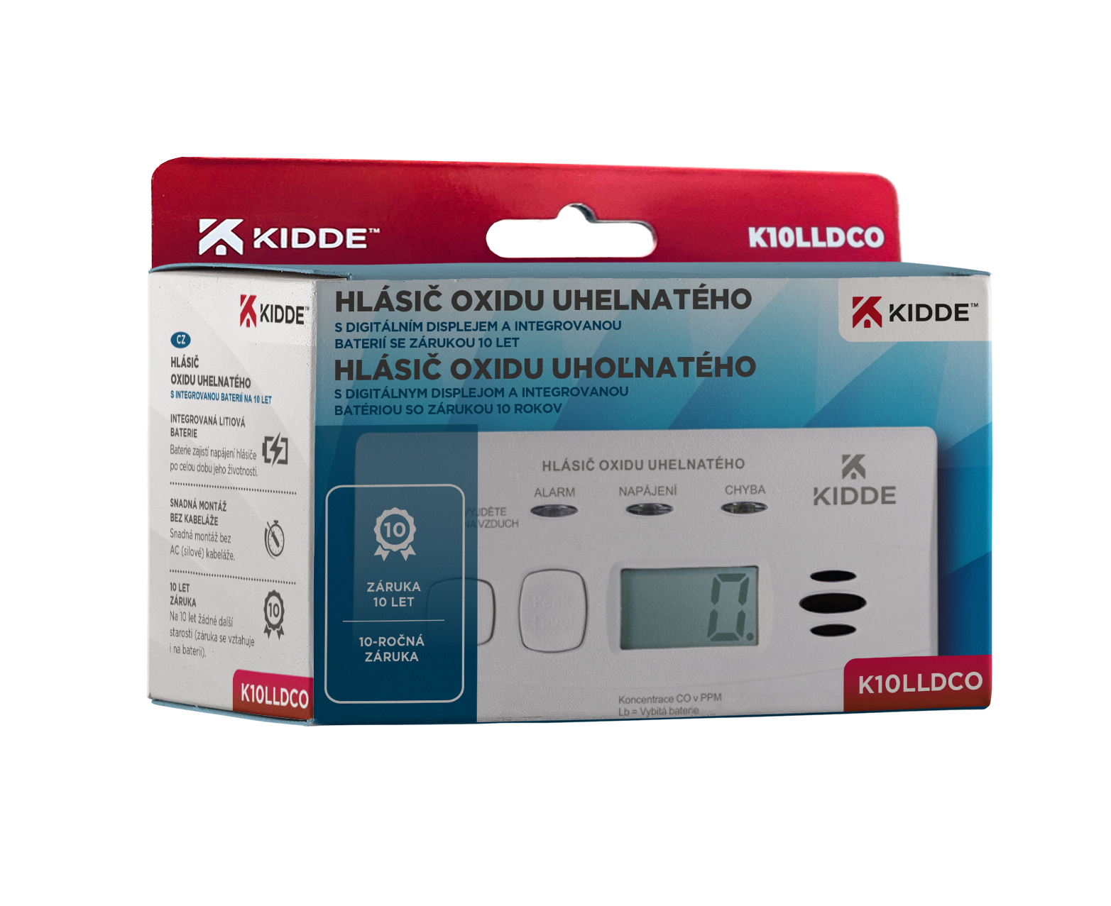 Hlásič úniku jedovatého plynu Kidde K10LLDCO je vybaven průmyslovým senzorem a integrovaným lithiovým napájecím zdrojem se životností a zárukou 10 let. Jeho provozní doba je tak o 40 % delší, než je tomu u většiny konvenčních alarmů CO běžně nabízených na našem trhu.