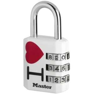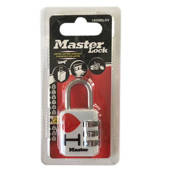 Visací kombinační zámek 1509EURDLOV je široký 30mm. Ocelový třmen o průměru 5mm je dlouhý 22mm. Vlastní nastavení 3-místné kombinace zámku. Barva: bílá, motiv „I love“. Cena za kus.