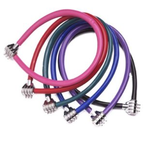 Ocelové kroucené kombinační lanko o délce 55cm a průměru 6mm má vinylový potah, který zabraňuje poškrábání. Obsahuje pevnou kombinaci 3 číslic. Barva fialová. Cena za kus.