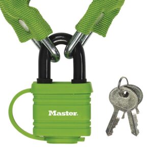 Zpevněný ocelový řetěz s ocelovým visacím zámkem je 90 cm dlouhý a obsahuje ocelové spojky o průměru 6 mm, které odolávají řezání. Nylonový kryt řetězu zabraňuje poškrábání. Visací ocelový zámek o průměru 40 mm je odolný proti povětrnostním vlivům. Plastový kryt na visacím zámku zabraňuje poškrábání. Třmen s průměrem 9 mm je vyroben z oceli pro odolnost proti řezání. Obsahuje 4-kolíkový válec zabraňující vyhmatání a dvojitou západku odolnou proti vypáčení.