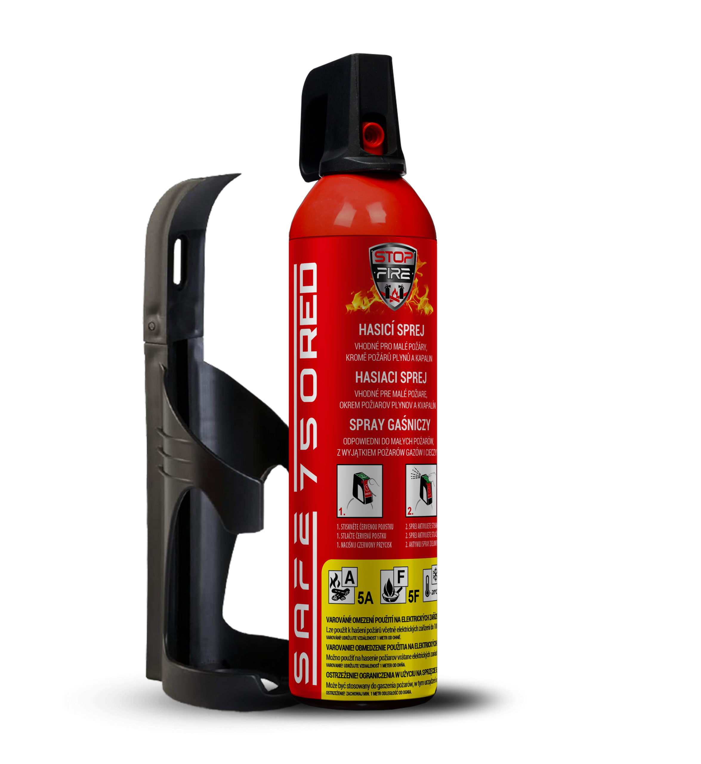 SAFE 750 RED přináší 750 ml vysoce účinného hasiva s dobou hašení až 25 sekund. Jeho hlavní výhodou je mimořádná odolnost vůči teplotním extrémům – bezpečně jej můžete skladovat i používat v rozmezí od -20 °C do +50 °C. Díky této vlastnosti patří mezi jedinečné mrazuvzdorné hasicí spreje ve své třídě, které si zachovávají plnou funkčnost i při výrazných změnách teplot.