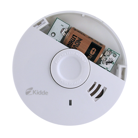 Optický detektor Kidde 10y29 (fotoelektrický) je napájený lithiovou baterií (zabudovanou, neměnitelnou) garantující napájení zařízení po dobu 10 let.