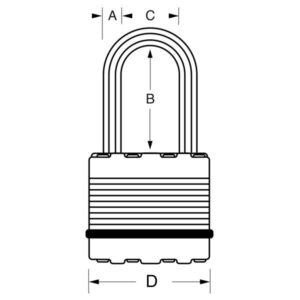 - Visací zámek o šířce 50 mm s tělem z vrstvené oceli zpevněný titanem pro vyšší odolnost a spolehlivost.