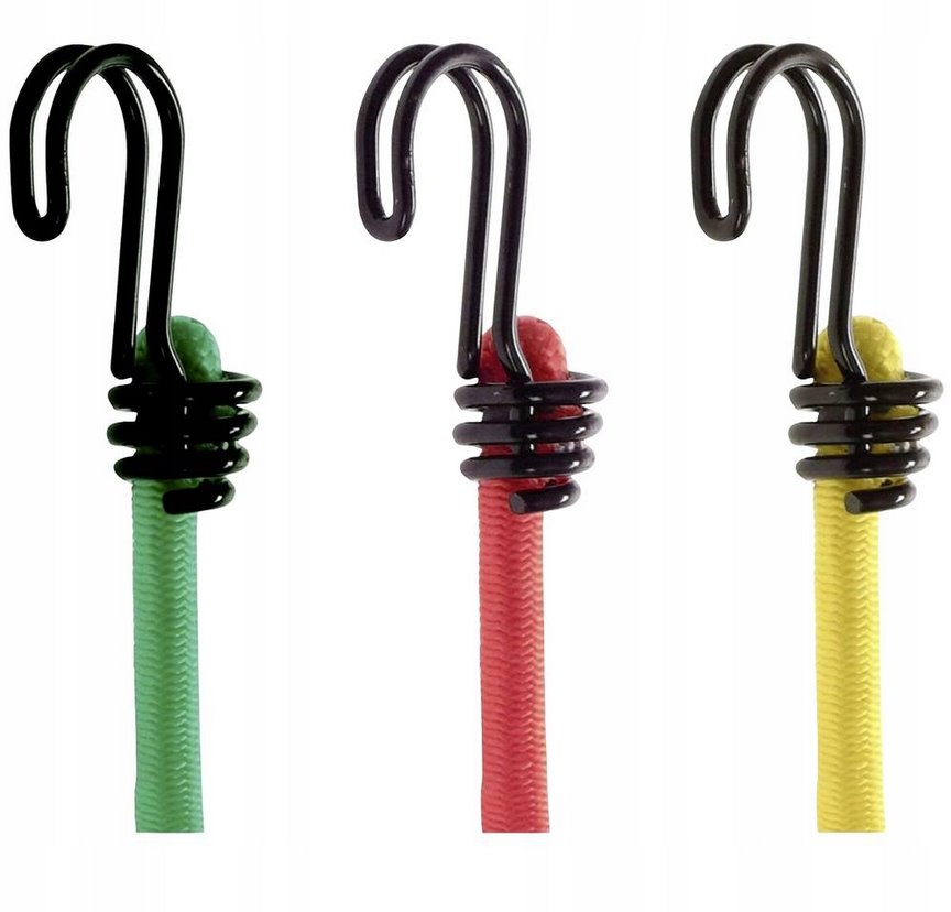 Set 10ks upínacích gum 3043EURDAT s dvojitými háčky na konci. Set obsahuje upínací gumy v délce 2 x 25cm + 2 x 60cm + 2 x 80cm + 2 x 100cm, všechny mají průměr 8 mm. Maximální nosnost činí 40 kg. Barva: dle délky gum (žlutá, červená, modrá, zelená).