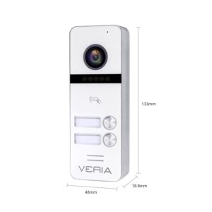 Vstupní kamerová jednotka VERIA 302 má rozlišení 2MP (1920 x 1080) a nabízí kvalitní obraz jak na monitoru, tak i v mobilní aplikaci. Kamerová jednotka disponuje výstupem pro ovládání el. zámku a vstupem pro odchozí tlačítko.