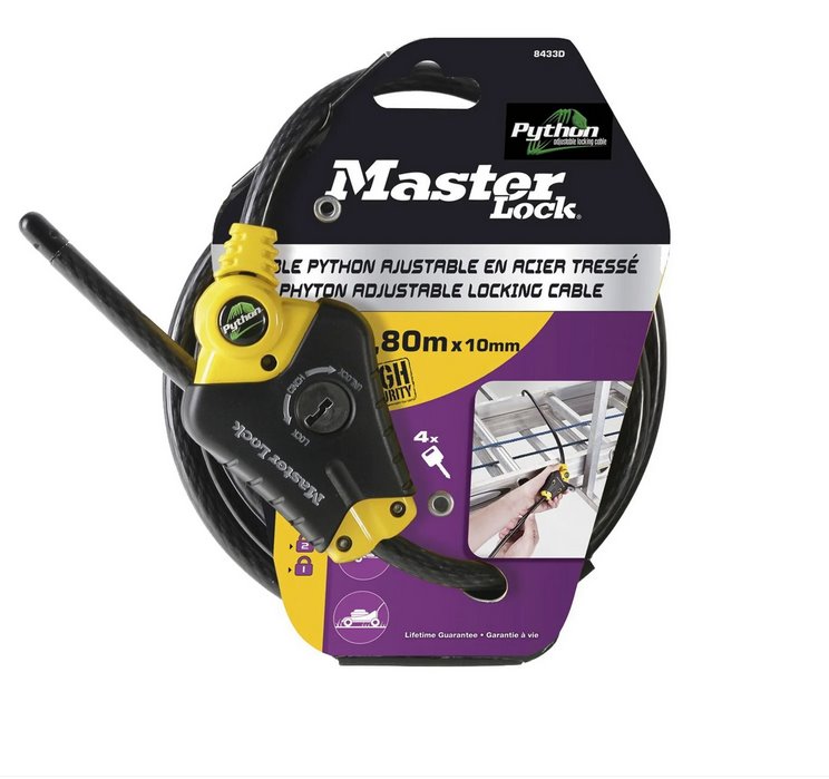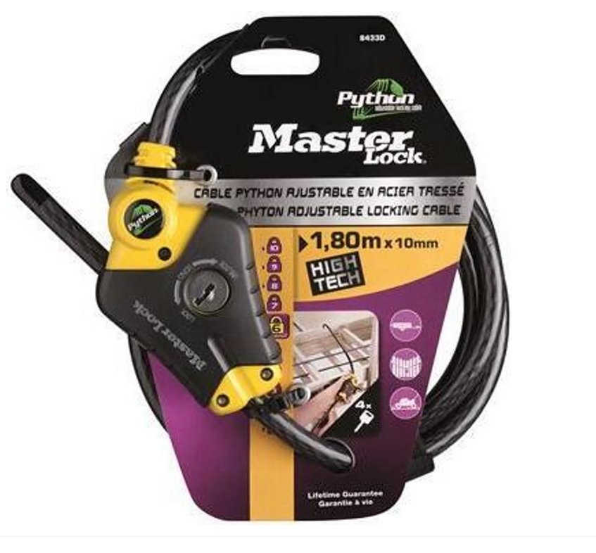 Všichni zloději si to dříve dvakrát rozmyslí, než zkříží cestu bezpečnostním produktům značky Master Lock. Master Lock-Python představuje kategorii nastavitelných lanových zámků, které jsou schopny díky svému ocelovému lanu cokoliv sevřít a zabezpečit. Jedná se o první nastavitelný a uzamykatelný kabel na světě, který má pro vaši aplikaci vždy tu správnou a potřebnou délku.