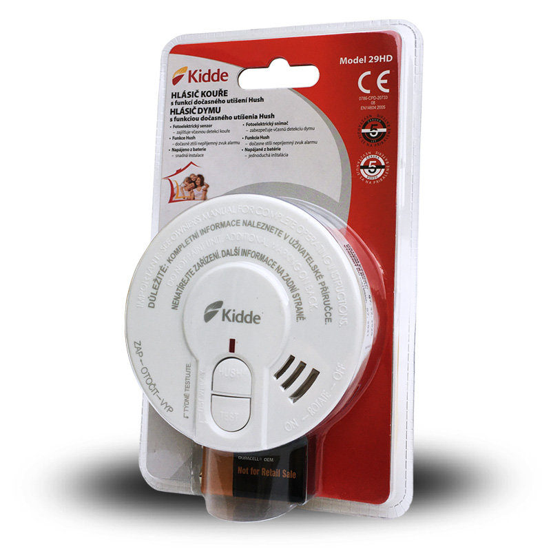 Hlásič požáru je vybaven testovacím tlačítkem TEST pro kontrolu správného fungování zařízení a HUSH pro přechodné umlčení požárního hlásiče pro případ planého alarmu. Stisknutí tlačítka způsobí okamžitou deaktivaci alarmu, na dobu asi 10minut, snížení citlivosti obvodů a vypnutí akustické signalizace hlásiče. Tlačítko HUSH používejte pouze tehdy, pakliže znáte příčinu aktivace hlásiče (např. při vaření nebo smažení). Po cca 10 minutách od deaktivace hlásiče se tento zcela automaticky resetuje do původního nastavení pro monitorování nebezpečí požáru. Pokud v místnosti zůstane vysoká koncentrace kouře, můžete stisknout tlačítko HUSH opakovaně a to až do okamžiku kdy je místnost řádně odvětrána. Tento model je vybaven nejmodernějším fotoelektrickým senzorem Kidde.